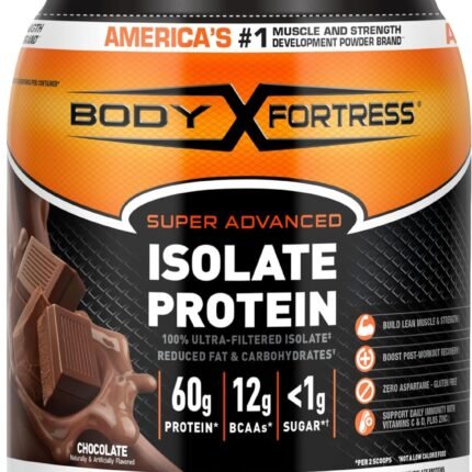 Body Fortress Super Advanced 100% Ultra-Filtered Isolate Protein Powder, Chocolate, 60g Protein & 12g BCAAs Per 2 Scoops, Muscle Gain & Recovery, Immune Support with Vitamins C & D, 1.5lbs