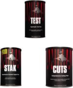 Animal Stak enhances testosterone and GH levels while blocking estrogen; take one pack daily for 21 days.