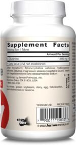 Jarrow Formulas L-Glutamine 1000 mg tablets provide the most abundant amino acid in the body for daily muscle tissue protection and immune support for athletes and people seeking to aid their health during periods of immune and muscular stress.* Made with high-quality, non-GMO ingredients, this vegan and gluten free dietary supplement contains no wheat, soybeans, dairy, egg, fish, shellfish, peanuts, tree nuts or sesame. Supplementation with Jarrow Formulas L-Glutamine helps support many metabolic processes including glycogen production and the synthesis and protection of muscle tissue.* L-Glutamine is also a major source of fuel for intestinal cells and supports the integrity of the intestinal lining.* This supplement made with 99% L-Glutamine is available in Easy-Solv tablets for fast and easy digestion.