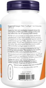 NOW Ultra Omega-3 softgels contain 500 EPA and 250 DHA. The natural fish oil concentrate used in this softgel is manufactured under strict quality control standards. It is tested to be free of potentially harmful levels of contaminants (i.e. mercury, heavy metals, PCB’s, dioxins, and other contaminants). Those who experience nausea or reflux from other fish oils should find this enteric coated, odor-controlled softgel easier to tolerate. Take 1 softgel 1 to 2 times daily with food.