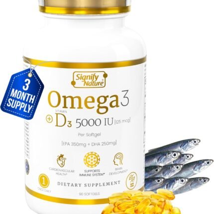 Omega 3 Fish Oil with Vitamin D3 5000 IU – 1000mg Triglyceride Fish Oil Capsules for Brain Health – Optimal Ratio EPA DHA Omega 3 Vitamin D 3 Blend – VIT D3 & Omega 3 Supplement – 90CT